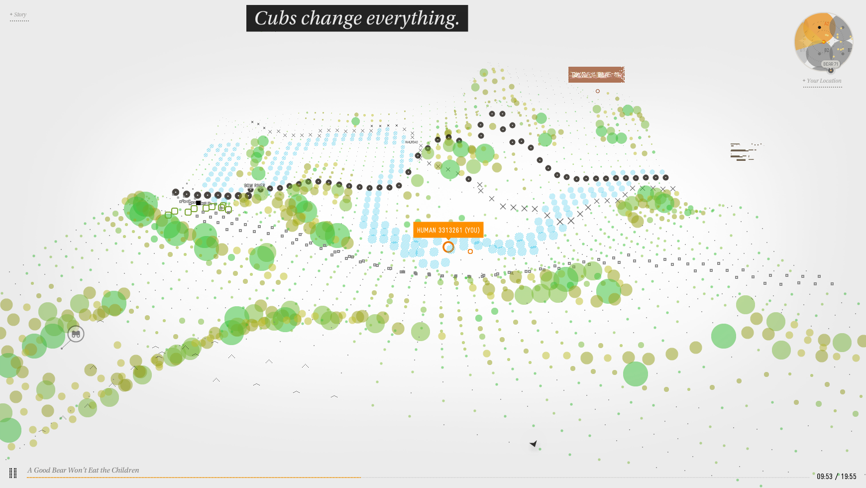 Over time, the trail of Bear 71 herself leaves its mark across the landscape. Should you follow her avatar, she leads you to content relative to the story as it unfolds.