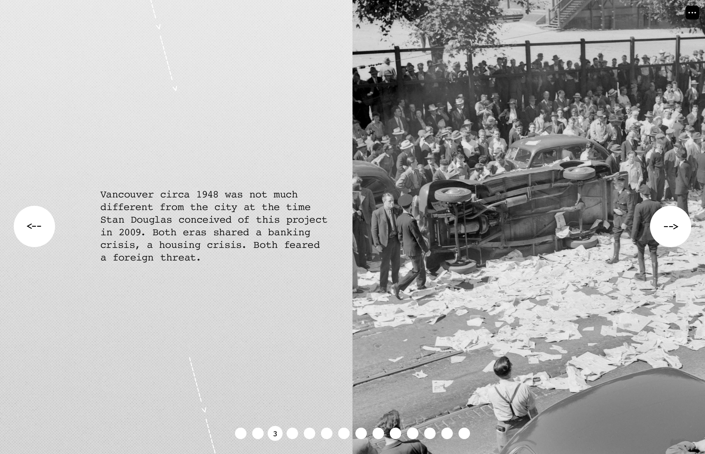 Circa 1948 is a 3D app and interactive installation by artist Stan Douglas, which made its world premier at the Tribeca Film Festival in 2014. Viewers are free to navigate wherever they like, through two communities in 1940s Vancouver that were eventually razed. The scenes are peopled by ghosts, and their conversations illuminate a period of rapid change, vice and corruption — a period that has historically escaped the spotlight.