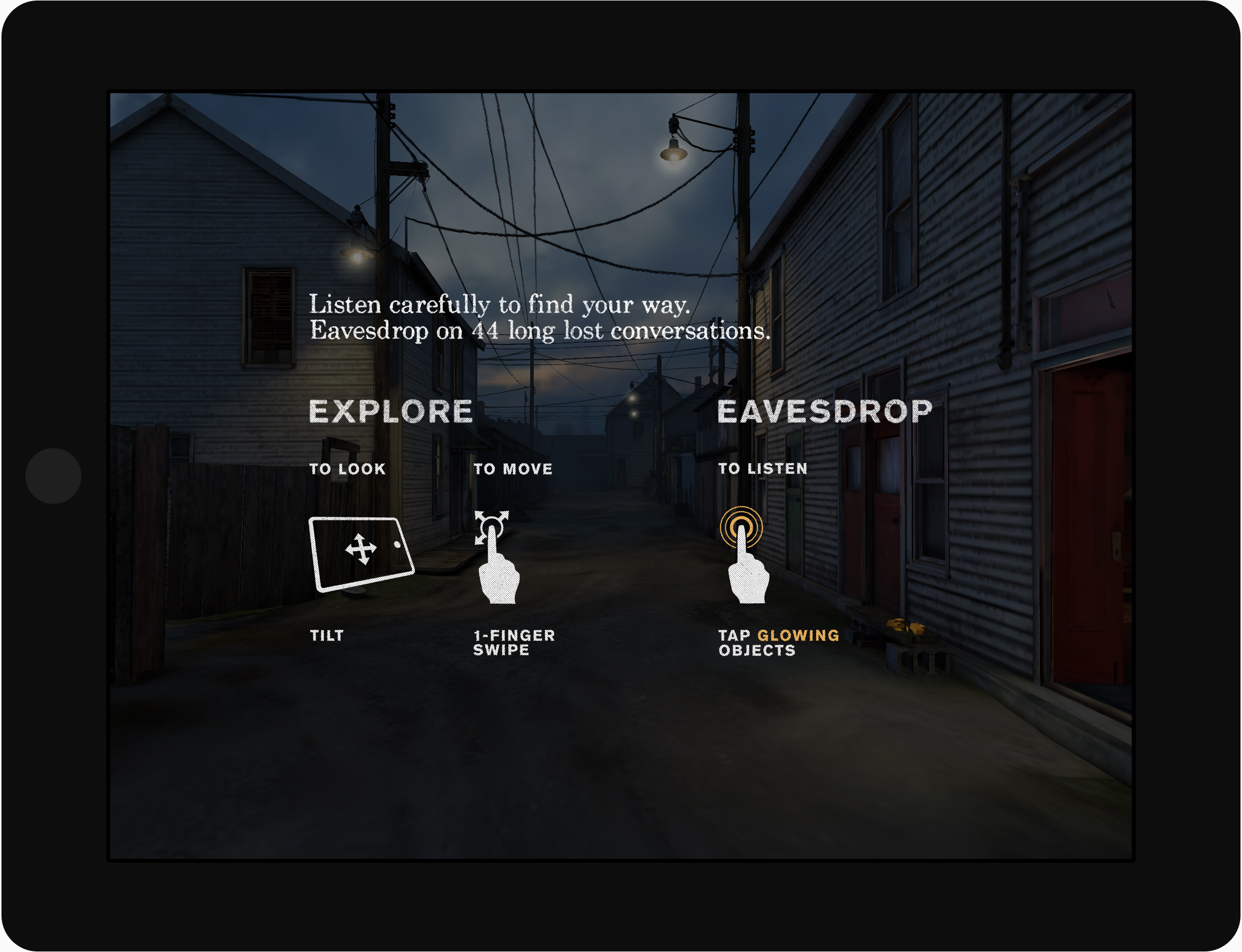 While the storyworld’s 3D scenes were carefully reproduced with period-accurate detail, the grit and tones of the archival photography also influenced my UI work for the app and promotional material.