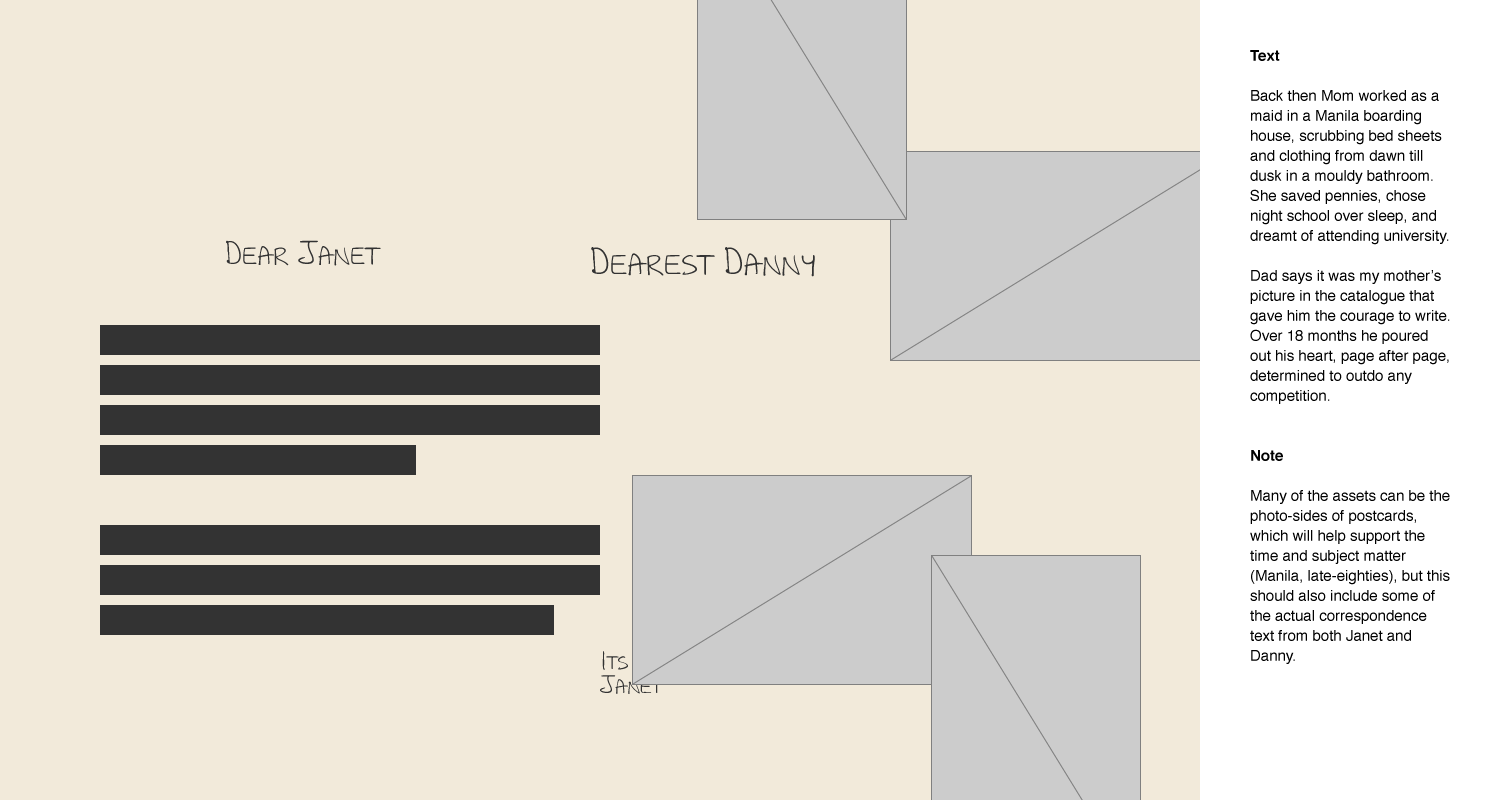 Working alongside creators with different degrees of control. For instance, the writer and producer of From Janet with Love were very loose with visual direction, while their counterparts on The Gift had designed a fixed-width comp, and my role was essentially to solve the design for a responsive build.